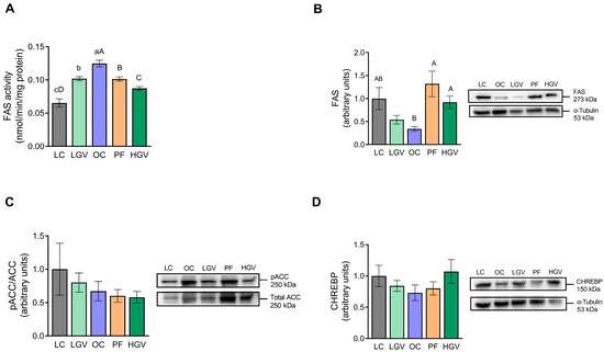 Activity of FAS (A), protein expression of FAS (B), phosphorylation ratio of ACC (C) and protein expression of CHREBP (D) in liver from lean (LC) or obese Zucker rats fed with a standard diet (OC), a standard diet supplemented with 2.5% (LGV) or 5% (HGV) of Gracilaria vermiculophylla or a restricted amount of standard diet (PF). Values are mean ± SEM. Lower cases represent differences among LC, OC and LGV groups, and upper cases represent differences among LC, OC, PF and HGV groups. Bars not sharing common letters are significantly different (p < 0.05). ACC: acetyl-CoA carboxylase, CHREBP: carbohydrate-responsive element-binding protein, FAS: fatty acid synthase.