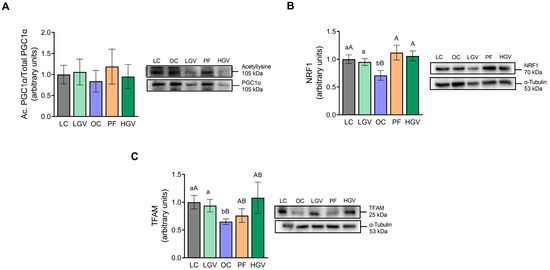 Acetylation ratio of PGC1α (A) and protein expression of NRF1 (B) and TFAM (C) in liver from lean (LC) or obese Zucker rats fed with a standard diet (OC), a standard diet supplemented with 2.5% (LGV) or 5% (HGV) of Gracilaria vermiculophylla or a restricted amount of standard diet (PF). Values are mean ± SEM. Lower cases represent differences among LC, OC and LGV groups, and upper cases represent differences among LC, OC, PF and HGV groups. Bars not sharing common letters are significantly different (p < 0.05). PGC1α: peroxisome proliferator-activated receptor gamma coactivator 1-alpha, NRF1: nuclear respiratory factor 1, TFAM: mitochondrial transcription factor A.