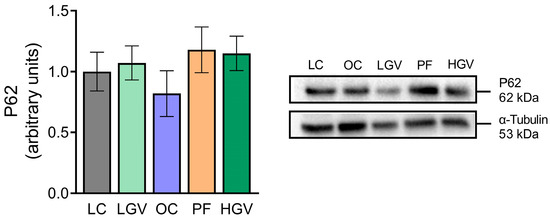 Protein expression of P62 in liver from lean (LC) or obese Zucker rats fed with a standard diet (OC), a standard diet supplemented with 2.5% (LGV) or 5% (HGV) of Gracilaria vermiculophylla or a restricted amount of standard diet (PF). Values are mean ± SEM. P62: sequestome-1.