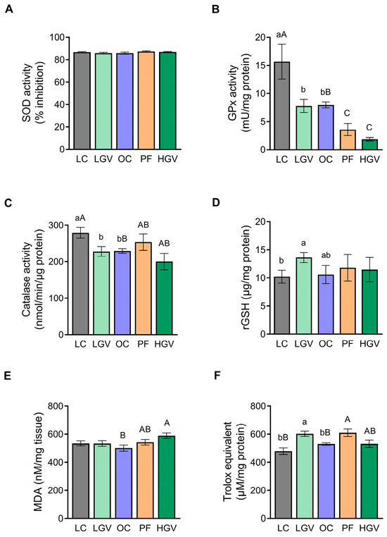 Regarding the activity of antioxidant enzymes, no differences were observed in SOD activity among the experimental groups (Figure 11A). By contrast, GPx activity was significantly lower in the OC group than in LC. The LGV group yielded no changes, while in the HGV group, GPx activity significantly decreased compared to the OC cohort. The PF rats similarly displayed reduced GPx activity in comparison with the OC group (Figure 11B). Concerning catalase, rats in the OC group exhibited a more reduced activity than those in the LC group, but no differences were observed among the other groups (Figure 11C). Regarding non-enzymatic antioxidant protection, no differences in rGSH levels were observed between the OC and LC groups. However, although not statistically significant (p = 0.1), values were increased by 30% in the LGV group when compared to OC (Figure 11D). Furthermore, MDA content, a marker of lipid peroxidation, was reduced in OC rats compared to their lean littermates. This reduction was reversed only in the HGV and PF groups (Figure 11E). Lastly, the total antioxidant capacity (Trolox equivalent) remained unaltered in the OC group compared to the LC counterpart. The administration of the low dose of the alga significantly increased this parameter in comparison to the OC group, but the high dose did not produce a similar effect. The PF group showed higher values than the OC cohort (Figure 11F).