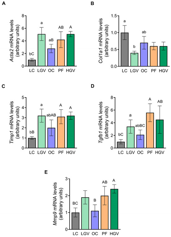 Acta2 (A), Col1a1 (B), Timp1 (C), Tgfb1 (D) and Mmp9 (E) mRNA levels in liver from lean (LC) or obese Zucker rats fed with a standard diet (OC), a standard diet supplemented with 2.5% (LGV) or 5% (HGV) of Gracilaria vermiculophylla or a restricted amount of standard diet (PF). Values are mean ± SEM. Lower cases represent differences among LC, OC and LGV groups, and upper cases represent differences among LC, OC, PF and HGV groups. Bars not sharing common letters are significantly different (p < 0.05). Acta2: α-smooth muscle actin, Col1a1: collagen 1, Mmp9: matrix metallopeptidase 9, Timp: tissue inhibitor of matrix metalloproteases, Tgfβ1: transforming growth factor beta1.
