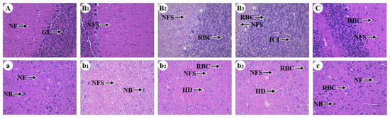 The microstructures of the Ces and Thi of chickens. Magnification: ×400. Uppercase letters represent Ces and lowercase letters represent Thi. (A) and (a): the 90-day control group; (B1) and (b1): the 30-day Pb exposure group; (B2) and (b2): the 60-day Pb exposure group; (B3) and (b3): the 90-day Pb exposure group; (C) and (c): the 90-day Se/Pb group. NF: nerve fibers, GL: granular layer, NFS: nerve fiber space, RBC: red blood cell (RBC), ICI: inflammatory cell infiltration, NB: Nissl body, HD: hydropic degeneration.