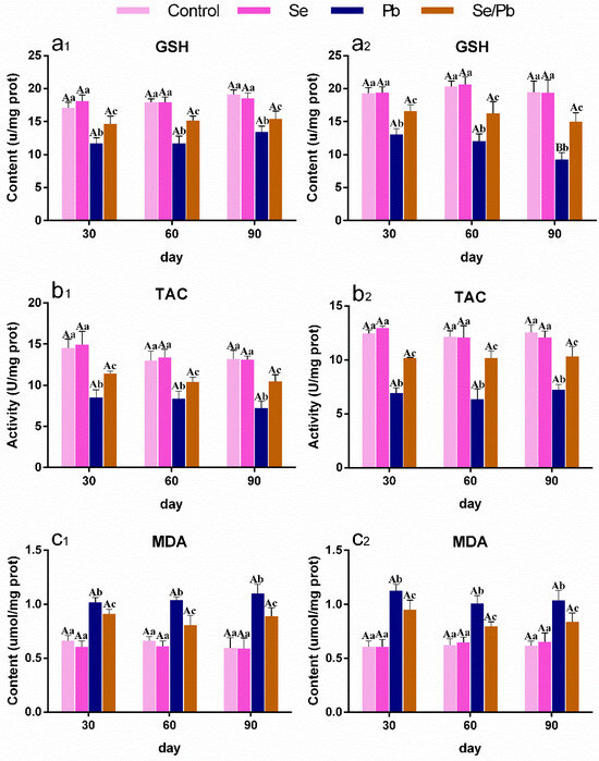 We measured GSH (Figure 2a1,a2) and MDA (Figure 2c1,c2) contents, as well as TAC activity (Figure 2b1,b2) with kits in chicken Ces (presented as number 1) and Thi (presented as number 2). As shown in Figure 2, there were no significant (p > 0.05) differences between the control group and the Se group in all three factors at the three time points. GSH content and TAC activity decreased significantly (p < 0.05) in the Pb group compared with the control and Se groups, on the contrary, MDA content increased significantly (p < 0.05) in the Pb group compared with the control and Se groups at all the three time points in chicken Ces and Thi. GSH content and TAC activity in the Se/Pb group were significantly (p < 0.05) higher than those in the Pb group and were significantly (p < 0.05) lower than those in the control and Se groups. MDA content in the Se/Pb group was significantly (p < 0.05) lower than that in the Pb group and was significantly (p < 0.05) higher than that in the control and Se groups. In addition, in the Pb group, GSH content in chicken Thi on day 90 was significantly (p < 0.05) down-regulated compared with that on days 30 and 60.