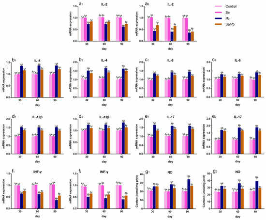 In order to explore the inflammatory mechanism of the Pb or/and Se effect on chicken Ces and Thi, mRNA levels of six inflammatory-related genes (including IL-2 (Figure 3a1,a2), IL-4 (Figure 3b1,b2), IL-6 (Figure 3c1,c2), IL-12β (Figure 3d1,d2), IL-17 (Figure 3e1,e2), and INF-γ (Figure 3f1,f2)) and the content of NO (Figure 3g1,g2) were detected under three time points using qRT-PCR and with kits, respectively, and the results are shown in Figure 3. No significant (p > 0.05) differences in any of the factors were found between the control group and the Se group at all three time points. IL-2 and INF-γ were significantly (p < 0.05) down-regulated; on the contrary, IL-4, IL-6, IL-12β, IL-17, and NO were significantly (p < 0.05) up-regulated at three time points in the Pb group compared with those in the control and Se groups in both Ces and Thi. IL-2 and INF-γ were significantly (p < 0.05) up-regulated; on the contrary, IL-4, IL-6, IL-12β, IL-17, and NO were significantly (p < 0.05) down-regulated at three time points in the Se/Pb group compared with those in the Pb group in both Ces and Thi, except for the insignificant (p > 0.05) up-regulation of IL-2 on day 90 and INF-γ on days 60 and 90 in Thi, as well as the insignificant (p > 0.05) down-regulation of IL-4 on days 30 and 90, IL-17 on day 30 in Thi, and NO on day 30 in Ces. IL-2 and INF-γ were significantly (p < 0.05) lower; on the contrary, IL-4, IL-6, IL-12β, IL-17, and NO were significantly (p < 0.05) higher at three time points in the Se/Pb group compared with those in the control and Se groups in both Ces and Thi. Additionally, regarding the Pb group, IL-2 and INF-γ mRNA levels on day 90 were significantly (p < 0.05) lower than those on days 30 and 60; on the contrary, NO content on day 90 was significantly (p < 0.05) higher than that on days 30 and 60 in both Ces and Thi. IL-6 mRNA levels in Ces and IL-17 mRNA levels in Thi on days 60 and 90 were significantly (p < 0.05) higher than those on day 30.