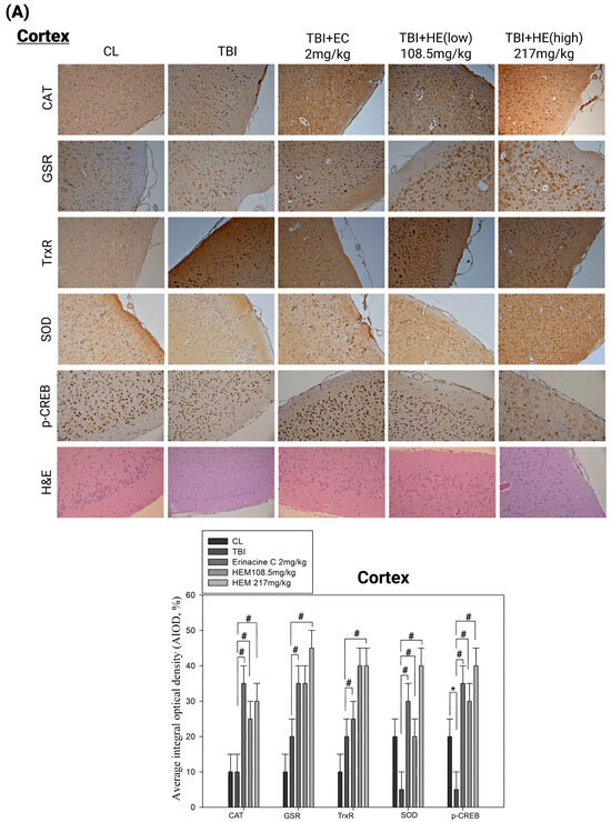 We then investigated the potential role of H. erinaceus mycelia in reducing oxidative stress and enhancing antioxidant enzyme activity in an mTBI model. We also examined the involvement of the Nrf2 signaling pathway and the expression of phospho-CAMP-response element-binding (p-CREB) in this process. The CREB protein is known for its pro-survival effects on neuronal differentiation, survival, and neurite outgrowth and plays a role in microglial activation and the regulation of inflammation-related gene expression through NF-κB modulation [36,37]. Phosphorylation of CREB can induce the production of anti-inflammatory cytokines in activated microglia [38,39,40]. According to Figure 5, the p-CREB expression in both the cerebral cortex and subcortex decreased in the mTBI rats group. However, treatment with erinacine C and oral feeding of H. erinaceus mycelium induced p-CREB protein expression (Figure 5A,B). We performed immunohistochemical staining on the cerebral cortex and subcortex neurocytes to evaluate the antioxidative gene expression and protein expression related to protective mechanisms against neuronal injury in cerebral concussion. We assessed the expression of catalase (CAT), glutathione reductase (GSR), thioredoxin reductase (TrxR), and superoxide dismutase (SOD). There was a significant increase in protein expression of these antioxidant enzymes in the cortex and subcortex of rats receiving H. erinaceus mycelium or erinacine C injection compared to the untreated mTBI group (Figure 5, # < 0.05). Thus, H. erinaceus mycelium and erinacine C treatments may contribute to the reduction of oxidative stress and activation of antioxidant defense mechanisms in the brain, potentially the induction of p-CREB expression.