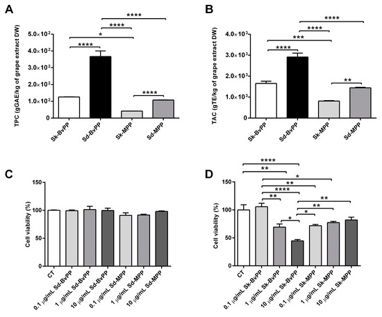 First, the composition and potential cell toxicity of GPP extracts were determined. These extracts presented different qualitative and quantitative PP composition (Table 1 and Table 2) in relation to grape tissues and ripening stage. The quantification of anthocyanins in grape Sd was not pursued, as these compounds are not known to be present in this particular tissue [28]. Analysis of monomeric flavan-3-ols was accompanied by a measure of the mDP of the proanthocyanidins. Sd extracts contained higher amounts of flavan-3-ols than Sk extracts, both decreasing with ripening. Flavan-3-ols were less polymerized in grape Sd compared to Sk. Additionally, the analysis indicated that the mDP of flavan-3-ols tended to decrease during the ripening process, leading to a reduction in proanthocyanidins in both Sd and Sk tissues (Table 1). Sk-MPP extracts wee rich in anthocyanins (Table 2). Stilbenes were also quantified in Sk extracts and their concentration increased as the grape ripened (Table 2). The highest total phenolic content (TPC) was observed at the Bv stage both in Sk and Sd extracts (Figure 2A) and significantly decreased to reach a minimum value at M stage (Figure 2A). Total antioxidant capacity (TAC) showed a similar trend; the highest value was found at Bv stage for both Sk and Sd extracts with a significant reduction at M stage (Figure 2B).