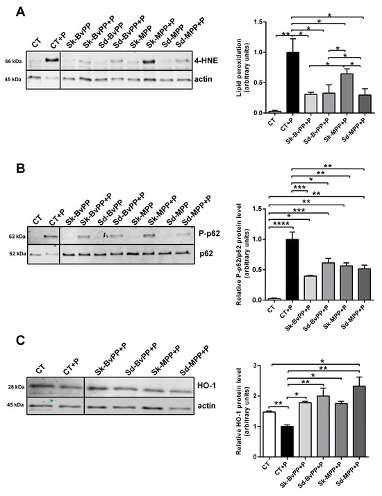 As shown in Figure 3A, treatment of human SM cells with GPP extracts produced a significant decrease in palmitate-induced lipid peroxidation if compared to GPP-untreated cells. When GPP extracts were added to palmitate, a lower phosphorylation of p62 compared to palmitate alone was observed (Figure 3B). While the intense phosphorylation in palmitate-treated human SM cells was accompanied by a decrease in HO-1 expression, the latter increased with GPP extract treatment compared to palmitate-treated cells (Figure 3C).
