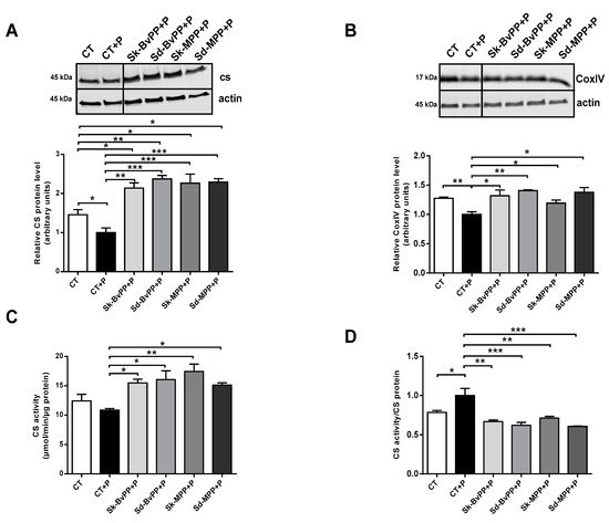 Treatment of human SM cells with GPP extract concomitantly to palmitate treatment improves their mitochondrial activity. Representative Western blot of CS (A) and CoxIV (B) protein expression analysis following treatment of human SM cells with palmitate and GPP extracts. Protein levels were expressed relative to actin level and to their levels in palmitate-treated human SM cells that was set at one. (C) CS activity of human SM cells treated with or without palmitate and GPP extracts. (D) Ratio between CS activity and CS protein level measured by Western blot. * p ≤ 0.05, ** p < 0.01, *** p < 0.001.