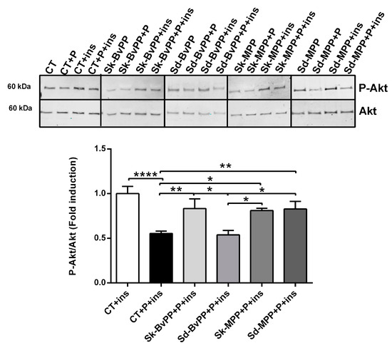All GPP extracts were able to significantly increase CS and CoxIV protein expression (Figure 4A,B) that was decreased after palmitate treatment. GPP extracts also increased CS activity (Figure 4C). After GPP extract treatment, the ratio between CS activity and CS protein amount was decreased compared to palmitate alone and reached the control level (Figure 4D). Interestingly, a significant increase in the insulin signaling pathway, measured by the rise of the P-Akt/Akt ratio following insulin stimulation, was obtained by treatment with all GPP extracts, except Sd-BvPP (Figure 5).