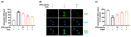 The impact of STIG on ROS production. (A) ROS levels were assessed by the addition of H2DCFDA. ### p < 0.001, compared with the untreated group (blank). ** p < 0.01 and *** p < 0.001, compared with the H2O2-treated group (control). (B) ROS (green) were observed under a fluorescence microscope (scale bar = 10 µm). (C) Analysis of intracellular GSH content was performed as described in Section 2.4. ### p < 0.001, compared with the untreated group (blank). *** p < 0.001, compared with the α-MSH-treated group (control).