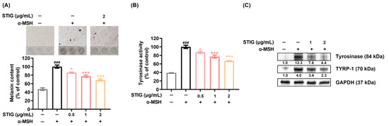 The impact of STIG on melanin content. The cells were pre-treated with STIG and then treated with α-MSH for 48 h. (A) Relative melanin levels were determined at 405 nm. Cell images were captured using a bright-field microscope (100× magnification). (B) Relative tyrosinase activity was analyzed at 475 nm. ### p < 0.001, compared with the untreated group (blank). * p < 0.05 and *** p < 0.001, compared with the α-MSH-treated group (control). (C) Protein levels were assessed using Western blot analysis. Each value below the blot was quantified relative to the untreated group (blank).