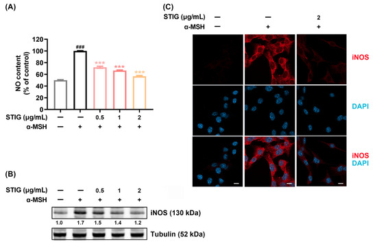NO acts as a melanogenesis stimulator by enhancing tyrosinase and TYRP-1 levels and synthesizing melanin pigments in melanocytes [9]. Therefore, we investigated the modulatory effect of STIG on NO production. The NO production was significantly increased by α-MSH. However, this NO production was inhibited when STIG was co-incubated with α-MSH (Figure 3A). We also assessed whether STIG regulates iNOS expression because NO is synthesized by iNOS. As shown in Figure 3B, α-MSH increased the iNOS expression, and this expression was suppressed by STIG. Furthermore, the inhibitory effect of STIG on iNOS levels was confirmed by immunofluorescence staining (Figure 3C).
