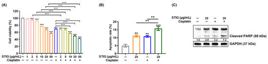 Melanin synthesis and oxidative stress are highly involved in melanoma progression [4]. Thus, we next investigated the effect of STIG on apoptosis in B16F10 cells. A cell viability assay revealed that STIG markedly decreased cell viability at concentrations exceeding 2 μg/mL (Figure 4A). Based on these results, 20 μg/mL of STIG was chosen for subsequent experiments. STIG increased the apoptotic rate, and co-incubation with cisplatin resulted in lower cell viability and higher levels of apoptosis compared with each single group (STIG concentrations above 10 μg/mL, Figure 4A,B). Immunoblots also show higher levels of cleaved PARP expression in the STIG co-culture with cisplatin (Figure 4C). Furthermore, STIG reduced the viability of A375 human melanoma cells, and co-incubation with cisplatin also led to lower cell viability compared with each single group (Figure S2).