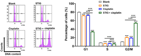The impact of STIG on cell cycle arrest. The cells were cultured with STIG (20 µg/mL) and cisplatin for 48 h, and cell cycle arrest was measured using flow cytometry. Summary data appear on the right. *** p < 0.001, compared with the untreated group (blank).