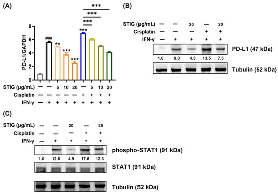 The impact of STIG on PD-L1 levels. Cells treated with STIG or cisplatin were exposed to IFN-γ for 24 h. (A) The PD-L1 mRNA and (B) protein expression were measured by qPCR and Western blots, respectively. Each value below the blot was quantified relative to the untreated group (blank). ### p < 0.001, compared with the untreated group (blank). ** p < 0.01 and *** p < 0.001, compared with the IFN-γ-treated group. (C) Cells treated with STIG or cisplatin were exposed to IFN-γ for 10 min. The protein levels of phospho-STAT1 were measured by Western blots.