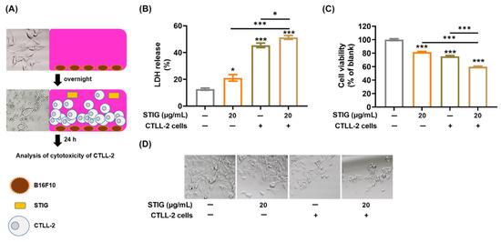 The impact of STIG on the cytotoxicity of CTLL-2 cells. (A) The image is a schematic diagram used to assess the cytotoxicity of CTLL-2 cells. (B) Cytotoxicity was assessed via an LDH release assay. (C) Cell viability was measured via an MTT assay. * p < 0.05 and *** p < 0.001, compared with the untreated group (blank). (D) Images of the remaining viable B16F10 cells were captured under a bright-field microscope (100× magnification).