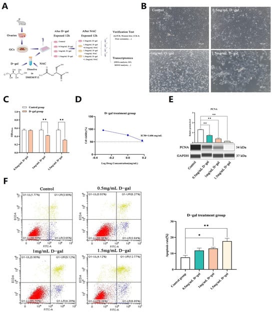 Primary GCs from rabbits were cultured, and once the cell confluence reached 80–90%, they were exposed to increasing doses of D-gal for 12 h. In the control group, the cell fusion degree was high, the cell spread was very open, the size was uniform, the shape was complete, the cells were closely connected, and the boundary was clear. However, in the D-gal group, the number of surviving cells decreased, the number of atypical cells increased, and the cell debris in the culture medium increased, which was more obvious with the increase in D-gal concentration (Figure 1B). Results of CCK-8 assays, performed to evaluate the cytotoxic effects of D-gal, subsequently showed that higher concentrations induced a significant and proportional decline in cell proliferation (p < 0.01). Specifically, at 1.5 mg/mL of D-gal, cell viability dropped by approximately 50% (IC50: 1.606 mg/mL) (Figure 1C,D), with a decrease in the expression of the PCNA (proliferating cell nuclear antigen) protein also noted at this concentration (p < 0.01) (Figure 1E). In addition, flow cytometry analysis showed that the apoptosis rate of GCs treated with 1.5 mg/mL D-gal was the highest, reaching 19.62% (Figure 1F).