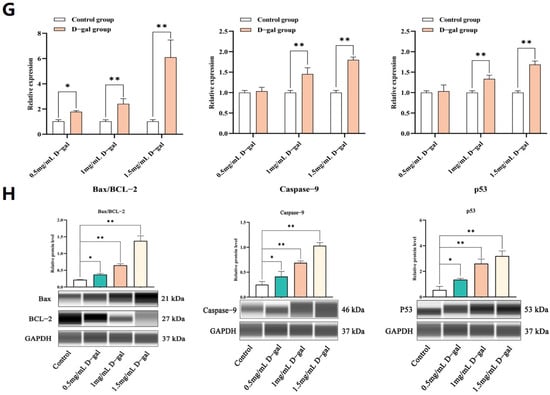 Additional analysis revealed that the mRNA and protein expression levels of Bax/BCL-2, Caspase-9, as well as p53 genes were significantly higher across all tested concentrations of D-gal (p < 0.05 or p < 0.01), as depicted in Figure 1G,H. These findings collectively demonstrated that D-gal could induce apoptosis in rabbit ovarian GCs in a dose-dependent fashion, with optimal effects observed at a concentration of 1.5 mg/mL.