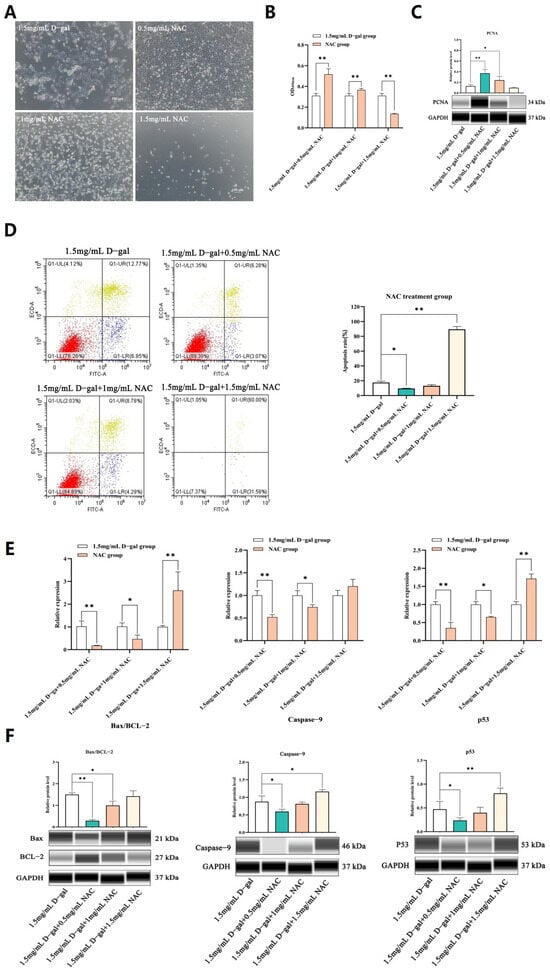 Subsequent assays further revealed that 0.5 mg/mL of NAC could significantly reduce cell apoptosis (p < 0.01) (Figure 2D). Additionally, qPCR and WB analyses demonstrated that, at this concentration, NAC significantly decreased the mRNA and protein expression levels of Bax/BCL-2, Caspase-9, and p53 compared with the control group, although these levels still increased at higher NAC concentrations (p < 0.05 or p < 0.01) (Figure 2E,F). Hence, it was speculated that 0.5 mg/mL of NAC was suitable to alleviate D-gal-induced apoptosis in GCs while stimulating proliferation.