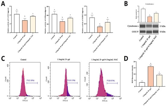 As shown in Figure 3A, there was a significant decrease in the cellular levels of CAT, GSH, and SOD enzymes after exposure to 1.5 mg/mL of D-gal compared with the untreated control group (p < 0.05). In contrast, treatment with 0.5 mg/mL NAC led to a significant increase in the levels of these antioxidant enzymes compared with the 1.5 mg/mL D-gal-treated group (p < 0.05). In addition, the findings of this study revealed increased ROS levels, along with a significant increase in the release of Cyt c within the 1.5 mg/mL D-gal-treated group (p < 0.05). However, on adding 0.5 mg/mL of NAC, the ROS levels decreased significantly, and this was reflected in a corresponding decrease in the amount of released mitochondrial Cyt c (p < 0.05) (Figure 3B–D).