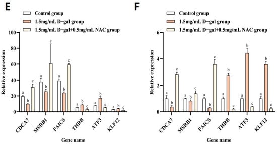 RNA-Seq analysis of NAC’s effect on rabbit ovarian GCs. (A) Volcano plot of DEGs. (B) Venn diagram illustrating DEG overlap between the control, 1.5 mg/mL D-gal-treated, and 0.5 mg/mL NAC-treated groups. (C) GO enrichment statistics were visualized as histogram plots where the horizontal axis represented GO classifications, the vertical axis showed gene counts, and the various colors represented different primary categories. (D) Dot plot presenting the top 20 enriched KEGG pathways; each dot symbolized a pathway with its name on the y-axis and enrichment factor on the x-axis. (E) The expression levels of CDCA7, MSRB1, PAICS, THRB, ATF3, and KLF12 genes at the time of sequencing. (F) The expression levels of CDCA7, MSRB1, PAICS, THRB, ATF3, and KLF12 genes were detected by qPCR. Data are presented as mean ± SEM; distinct lowercase letters (a, b, c) denote significant differences between groups, while identical letters imply the absence of a statistically significant difference. Statistical analysis was conducted using a paired two-tailed t-test.