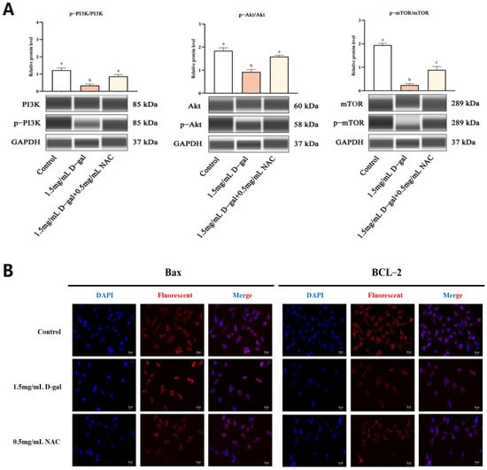The PI3K/Akt/mTOR signaling cascade plays a crucial role in regulating apoptosis. To explore whether NAC could modulate D-gal-induced apoptosis in GCs through this pathway, the protein expression was scrutinized. WB analysis revealed that, compared with the controls, the ratios of p-PI3K/PI3K, p-AKT/AKT, and p-mTOR/mTOR were significantly reduced in GCs treated with 1.5 mg/mL of D-gal (p < 0.01). Conversely, treating the cells with 0.5 mg/mL of NAC led to a significant increase in these phosphorylation ratios (p < 0.05) (Figure 5A). Additionally, immunofluorescence (IF) staining showed that the fluorescence intensity of Bax was significantly heightened, while that of BCL-2 decreased in the 1.5 mg/mL D-gal-treated group compared with the control. When 0.5 mg/mL of NAC was added, Bax’s signal intensity lessened, while that of BCL-2 increased (Figure 5B).