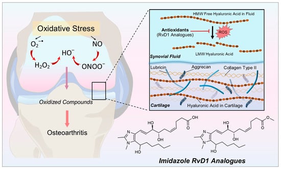 Oxidative stress and its mechanism in osteoarthritis: the primarily formed radicals, superoxide radical (O2−•), can be converted to more harmful species such as hydroxyl radicals (OH•) and hydrogen peroxide (H2O2). Imidazole-derived RvD1 analogues as antioxidant molecules scavenge ROS via their active sites to protect against the degradation of high molecular weight hyaluronic acid (HMW HA) to low molecular weight hyaluronic acid (LMW HA).