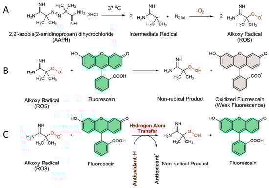 ORAC assay mechanism. (A) Generating ROS (alkoxy radical) by thermal decomposition of 2,2′-azobis(2-amidinopropan) dihydrochloride (AAPH) in the presence of oxygen. (B) Reacting ROS with fluorescein (fluorescent probe) without antioxidant compounds and production of non-fluorescent molecule. (C) Inhibition of ROS by antioxidants and protection of fluorescein from radical attack.