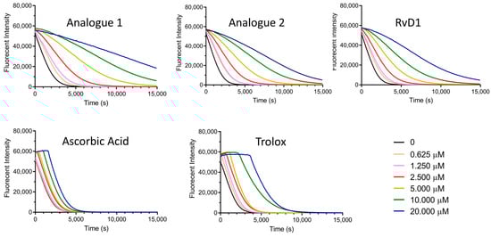 In Figure 5, the typical time-dependent decays of fluorescence intensity of fluorescein induced by AAPH alone, or in the presence of antioxidants (final concentration range between 0.625 and 20 μM), were illustrated. After the pre-incubation of fluorescein with different concentrations of the antioxidants (including Analogue 1, Analogue 2, RvD1, ascorbic acid, and Trolox), dose-dependent inhibitions of the fluorescence decay were monitored. As seen in Figure 5, both Analogues 1 and 2 showed the ability of free radical quenching in the radical propagation cascade. According to the shape of their fluorescence decay curves, there is no clear distinction between lag time and fluorescein decay periods by increasing the concentrations of the analogues, indicating more complex scavenging kinetics. On the other hand, a very low change was observed for RvD1 by increasing the concentrations, which means low scavenging kinetics at the tested condition (Figure 5). Ascorbic acid and Trolox as controls were also tested to compare the antioxidant capacity of the samples. Although ascorbic acid is a very strong antioxidant molecule, as seen in Figure 5, it has a relatively low decay of fluorescence intensity at the tested concentration ranges. Trolox as another control showed a clear lag time, proving that it has antioxidant properties to protect fluorescein from ROS (Figure 5). As a blank control, fluorescein was exposed to excitation light at 485 nm in the absence of AAPH and antioxidants during the assay. The results proved that there is no significant fluorescence intensity change; thus, fluorescein is a stable fluorescent probe according to the analysis.