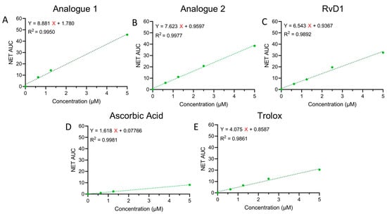 ORAC calibration curves for Analogue 1 (A), Analogue 2 (B), RvD1 (C), ascorbic acid (D), and Trolox (E).