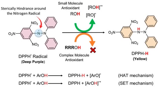 Reaction mechanism of 2,2-diphenyl-1-picrylhydrazyl (DPPH) with two different types of antioxidants (small molecules and complex molecules) via hydrogen atom transfer (HAT) or single electron transfer (SET). Low possibility of interaction between complex molecules and DPPH radical due to the steric hindrance around the radical.