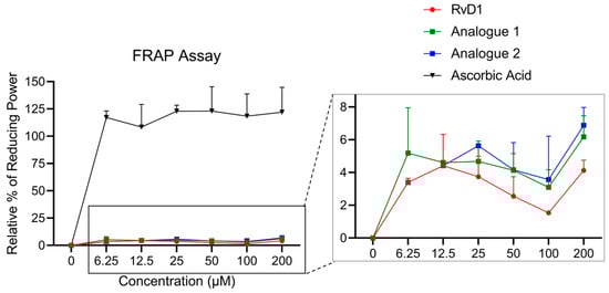 The FRAP assay is a rapid and automated assay that measures the electron-donating ability of an antioxidant to reduce the ferric 2,4,6-tripyridyl-s-triazine complex [Fe3+-(TPTZ)2]3+ to the intense, blue-colored ferrous complex [Fe2+-(TPTZ)2]2+ under acidic condition (pH = 3.6) [49]. Trolox equivalent (TE) is a unit of measurement used to express the antioxidant capacity of a substance relative to Trolox. All measurements for both Trolox and the sample should be made under the same conditions and concentrations [50]. The TE of ascorbic acid, RvD1, Analogue 1, and Analogue 2 were calculated based on the Trolox calibration curve. The TE values were obtained 242.53 ± 46.16, 8.65 ± 1.19, 12.71 ± 2.51, and 14.12 ± 2.14 µM at the highest treated concentration (200 µM), respectively. Additionally, the relative percentage of reducing power was also calculated at the same concentrations, and it was around 122.03% ± 22.81 for ascorbic acid at 200. However, this value for RvD1, Analogue 1, and Analogue 2 was much less, 4.12% ± 0.62, 6.17% ± 1.28, and 6.88% ± 1.09, respectively (Figure 8). All data confirmed that the RvD1 analogues showed almost two times higher antioxidant activity compared to RvD1. To figure out why the analogues with potential antioxidant abilities have very little electron-donating ability compared to controls (ascorbic acid and Trolox), the redox condition mechanism should be considered. Redox conditions refer to media dominated by oxidants (electron acceptors), the substances that can oxidize other substances (cause them to lose electrons), or reductants (electron donors), which are the substances that can reduce other substances.