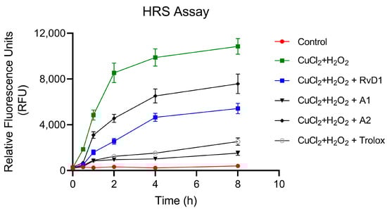 The hydroxyl radical scavenging activity of RvD1 and analogues was performed in a 96-well black plate in the presence of CuCl2 and H2O2 in acellular conditions [44]. Briefly, 10 μM CuCl2 and 100 μM H2O2 were mixed in a 100 μL/well of PBS (75 mM, pH 7.4) in the presence or absence of RvD1, Analogue 1, Analogue 2, and Trolox at a concentration of 10 μM. Then, afterwards, 100 μL of DCFH-DA probe solution was added to each well in a final concentration of 20 μM. The fluorescence was measured at 0, 0.5, 1, 2, 4, and 8 h after the exposure time, using a microplate reader with fluorescence polarization (Polar Star Optima, BMG Labtech, Ghelph, Canada) set up at an excitation wavelength of 485 nm and emission wavelength of 530 nm. The results were expressed as relative fluorescence units (RFU).
