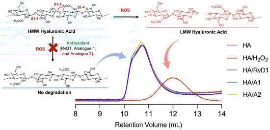The hyaluronic acid degradation assay was performed as described by Chen et al. [44] with minor modifications. Briefly, a solution of HA at 1 mg/mL was treated with 10 μM CuCl2, 100 μM H2O2 in the presence or absence of Trolox, RvD1, or analogues at a final concentration of 10 μM. The reaction was conducted in 37 °C during 16 h. Then, 20 μg of HA was loaded into an agarose gel (2% prepared in TBE buffer) using a loading buffer containing 0.25% of bromophenol blue solubilized in formamide. After 4 h of migration at 40 volts, the HA was visualized after staining with Stain-All dissolved in 30% ethanol.