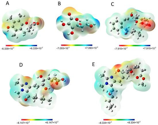 The molecular electrostatic potential surface (ESP) of Trolox (A), ascorbic acid (B), RvD1 (C), Analogue 1 (D), and Analogue 2 (E).