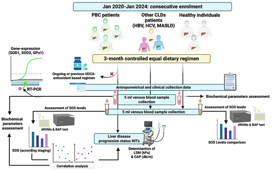 Experimental design. Anthropometrical parameters’ collection enclosed the determination of body mass index (BMI). Clinical evaluation included the complete medical history collection, nutritional assessment, smoking, drug abuse, comorbidities, and the concomitant therapies record. Biochemical variables: aspartate aminotransferase (AST), alanine aminotransferase (ALT), platelets count (PLT), gamma–glutamyl transferase (GGT), alkaline phosphatase (ALP), albumin, total bilirubin (TB). PBC: Primary Biliary Cirrhosis; CLDs: chronic liver disorders; HBV: Hepatitis B virus infection; HCV: Hepatitis C virus infection; MASLD: metabolic dysfunction-associated steatotic liver disease; NITs: non-invasive tools; LSM: liver stiffness measurement; CAP: controlled attenuation parameter; SOS: systemic oxidative stress status; SOD: superoxide dismutase; GPx: glutathione peroxidase; RT-PCR: realtime polymerase chain reaction; UDCA: ursodeoxycholic acid.