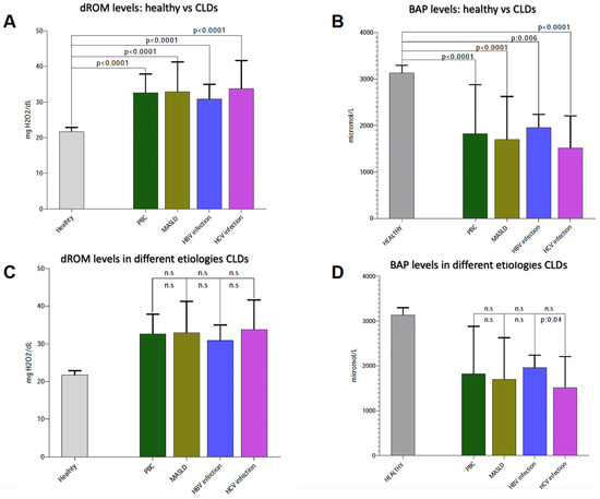 Systemic oxidative stress assessment. (A) Comparison of dROM levels between healthy patients and patients with CLDs (PBC, MASLD, HBV, HCV); (B) comparison of BAP levels between healthy patients and patients with CLDs (PBC, MASLD, HBV, HCV); (C) comparison of dROM levels between different etiologies for patients with CLDs (PBC, MASLD, HBV, HCV); (D) comparison of BAP levels between different etiologies for patients with CLDs (PBC, MASLD, HBV, HCV). Biological antioxidant potential, dROMs: Reactive Oxygen Metabolites (dROMs); PBC: Primary Biliary Cholangitis; MASLD: metabolic dysfunction-associated steatotic liver disease; HBV: Hepatitis B infection; HCV: Hepatitis C infection. n.s.: not statistically significant.