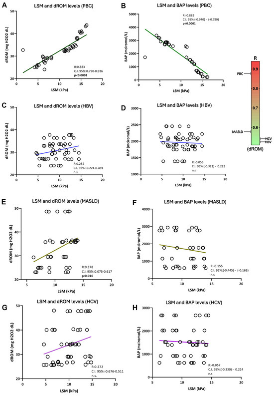 The correlation between systemic oxidative stress and LSM-assessed hepatic fibrosis entity. Linear regression analysis with correlations between LSM and dROM levels (A), and LSM and BAP levels (B) in PBC; linear regression analysis with correlations between LSM and dROM levels (C), and LSM and BAP levels (D) in HBV; linear regression analysis with the correlations between LSM and dROM levels (E), and LSM and BAP levels (F) in MASLD; linear regression analysis with the correlations between LSM and dROM levels (G), and LSM and BAP levels (H) in HCV. Biological antioxidant potential, dROMs: Reactive Oxygen Metabolites (dROMs); PBC: Primary Biliary Cholangitis; MASLD: metabolic dysfunction-associated steatotic liver disease; HBV: Hepatitis B infection; HCV: Hepatitis C infection. Statistically significant differences (p < 0.05) are reported in bold; n.s.: not statistically significant.