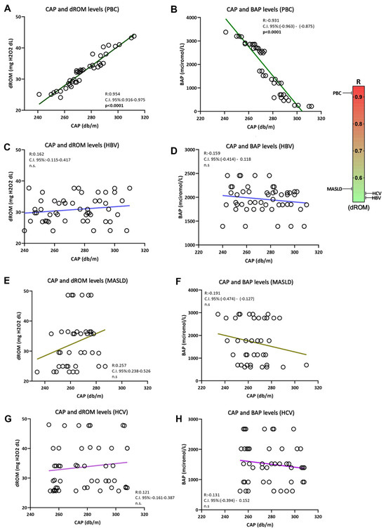 The correlation between systemic oxidative stress and CAP-assessed hepatic steatosis severity. Linear regression analysis with correlations between CAP and dROM levels (A), and CAP and BAP levels (B) in PBC; linear regression analysis with correlations between CAP and dROM levels (C), and CAP and BAP levels (D) in HBV; linear regression analysis with correlations between CAP and dROM levels (E), and CAP and BAP levels (F) in MASLD; linear regression analysis with correlations between CAP and dROM levels (G), and CAP and BAP levels (H) in HCV. Biological antioxidant potential, dROMs: Reactive Oxygen Metabolites (dROMs); PBC: Primary Biliary Cholangitis; MASLD: metabolic dysfunction-associated steatotic liver disease; HBV: Hepatitis B infection; HCV: Hepatitis C infection. Statistically significant differences (p < 0.05) are reported in bold; n.s.: not statistically significant.