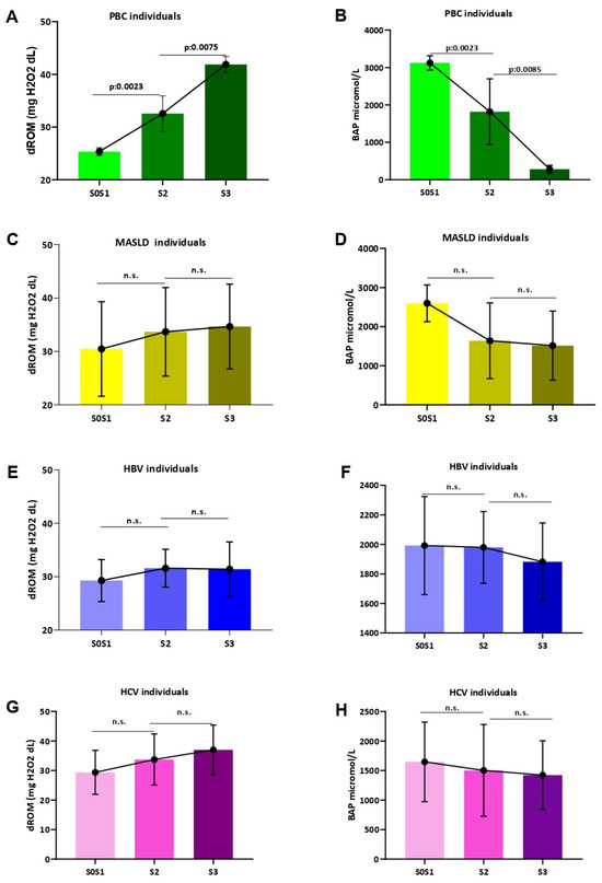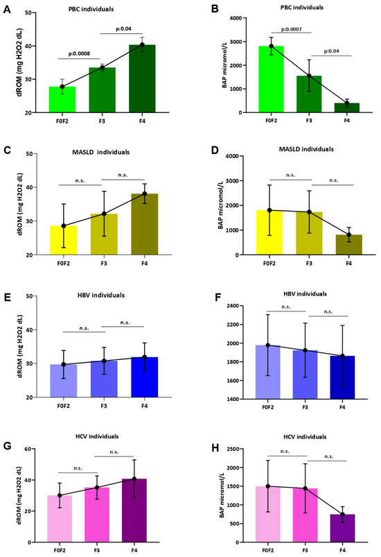 Systemic oxidative stress assessment according to hepatic fibrosis staging. The assessment of dROM values according to LSM-determined hepatic fibrosis stage in patients with PBC (A), MASLD (C), HBV (E), and HCV (G). The assessment of BAP levels according to LSM-determined hepatic fibrosis stage in PBC (B), MASLD (D), HBV (F), and HCV (H) patients. Biological antioxidant potential, dROMs: Reactive Oxygen Metabolites (dROMs); PBC: Primary Biliary Cholangitis; MASLD: metabolic dysfunction-associated steatotic liver disease; HBV: Hepatitis B infection; HCV: Hepatitis C infection.; Mann–Whitney U test was adopted. Statistically significant differences (p < 0.05) are reported in bold; n.s.: not statistically significant.