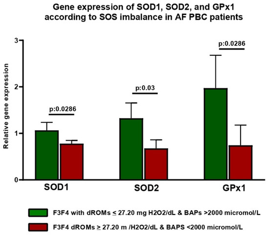 Finally, the real-time PCR analysis revealed a downregulated expression of SOD1, SOD2, and GPx1 genes in patients with AF-PBC presenting SOS imbalance compared with patients with AF-PBC with a balanced systemic oxidative status (SOD1, p = 0.02; SOD2, p = 0.03; GPx1, p = 0.02) (Figure 8).