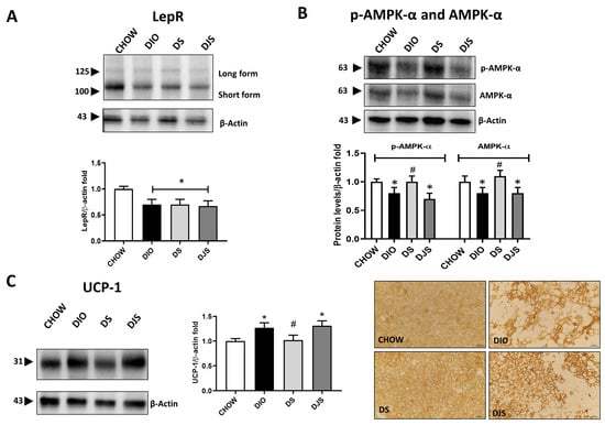 Metabolic evaluation of whitened brown adipose tissue. Western blot analysis of (A) leptin receptor isoforms (LepR); (B) phospho-adenosine monophosphate-activated protein kinase-α (p-AMPK-α) and adenosine monophosphate-activated protein kinase-α (AMPK-α). Graphs show the densitometric ratios of bands and β-actin expression used to normalize the data. (C) Immunoblot of uncoupling protein-1 (UCP-1) and relative graphs that show the trend of the expression of proteins related to β-actin expression were used to normalize the data. Representative pictures of the immunohistochemistry reaction of interscapular brown adipose tissue against UCP-1. CHOW: rats fed with a standard diet; DIO: rats fed with a high-fat diet; DS: DIO rats supplemented with tart cherry seeds; DJS: DS rats supplemented with tart cherry juice. Magnification 20×. Scale bar: 50 μm Data are means ± SEM. * p < 0.05 vs. CHOW rats; # p < 0.05 vs. DIO rats.
