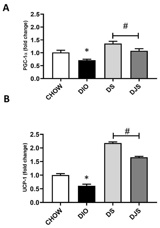 qRT-PCR analysis of the expression of key regulator genes in brown adipocyte metabolic activity. mRNA expression levels of (A) peroxisome proliferator-activated receptor-gamma coactivator 1α (PGC-1α) and (B) uncoupling protein 1 (UCP-1). CHOW: rats fed with a standard diet; DIO: rats fed with a high-fat diet; DS: DIO rats supplemented with tart cherry seeds; DJS: DS rats supplemented with tart cherry juice. Data are means ± SEM. * p < 0.05 vs. CHOW rats; # p < 0.05 vs. DIO rats.