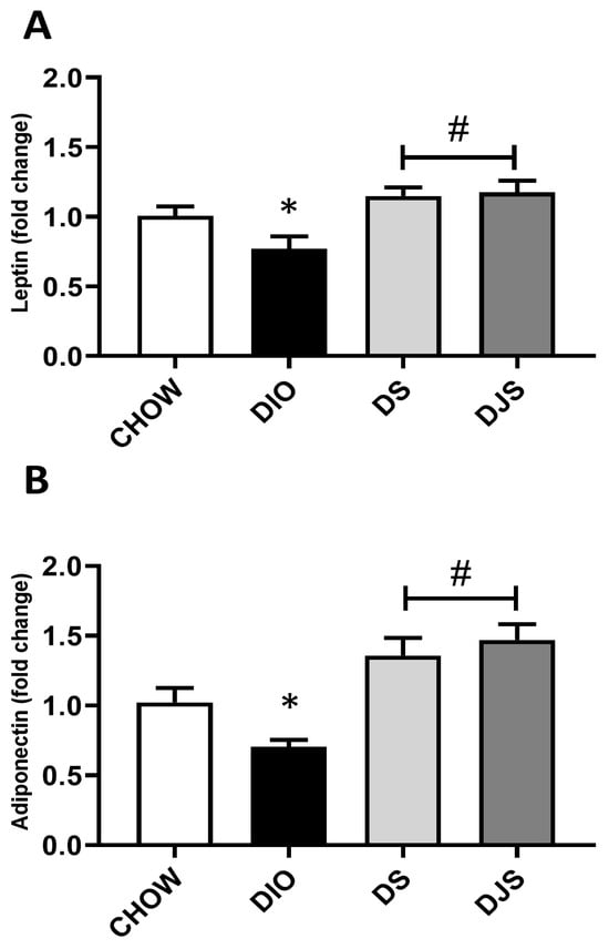 Gene expression of whitened adipocyte-secreted factors. mRNA expression levels of (A) leptin and (B) adiponectin in interscapular brown adipose tissue. CHOW: rats fed with a standard diet; DIO: rats fed with a high-fat diet; DS: DIO rats supplemented with tart cherry seeds; DJS: DS rats supplemented with tart cherry juice. Data are means ± SEM. * p < 0.05 vs. CHOW rats; # p < 0.05 vs. DIO rats.