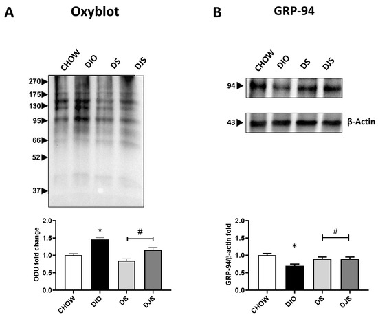 Oxidative and ER stress in brown adipose tissue. Oxyblot in brown adipose samples and the graph demonstrate the measurements of density expressed as optical density units (ODU) (A). Adipose tissue lysates were immunoblotted with anti-glucose-regulated protein-94 (GRP-94) (B) and relatives’ graphs that indicate the densitometric ratio of band and β-actin expression were used to normalize the data. CHOW: rats fed with a standard diet; DIO: rats fed with a high-fat diet; DS: DIO rats supplemented with tart cherry seeds; DJS: DS rats supplemented with tart cherry juice. Data are means ± SEM. * p < 0.05 vs. CHOW rats; # p < 0.05 vs. DIO rats.