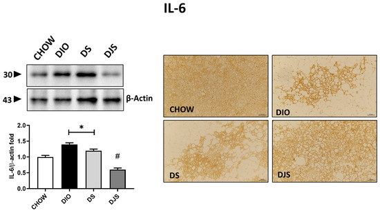 Inflammation in brown adipose tissue. Western blot analysis of interleukin-6 (IL-6). Graph shows the densitometric ratios of bands and β-actin expression used to normalize the data. Representative pictures of the immunohistochemistry reaction of interscapular brown adipose tissue against IL-6. Data are mean ± SEM. * p < 0.05 vs. CHOW rats; # p < 0.05 vs. DIO rats. CHOW: rats fed with a standard diet; DIO: rats fed with a high-fat diet; DS: DIO rats supplemented with tart cherry seeds; DJS: DS rats supplemented with tart cherry juice. Magnification 20×. Scale bar: 50 μm.