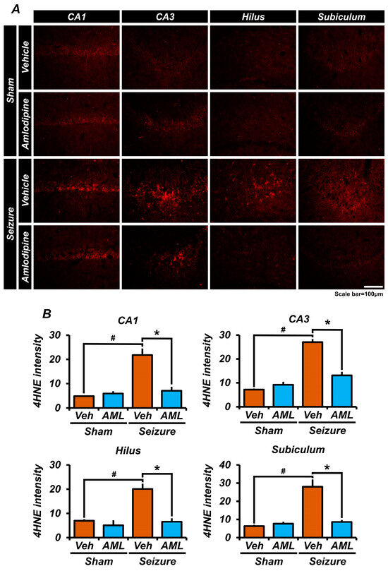 Administration of amlodipine decreased reactive oxidative stress (ROS) after seizure. ROS was detected using 4-hydroxy-2-nonenal (4HNE) (red) staining in the hippocampal CA1, CA3, dentate gyrus (DG), and subiculum (Sub) regions, 7 days after the seizure. (A) Micrographs showing 4HNE (red) in the hippocampal CA1, CA3, DG, and Sub regions. (B) In every region, there was no significant difference between the sham groups. There were differences in intensity between the seizure-vehicle and seizure-amlodipine groups in every region, including the CA3 region. In every region, the intensity was similar between the sham groups and the seizure-amlodipine-treated group, and there was also a significant difference between the sham-vehicle group and the seizure-vehicle group. Therefore, administering amlodipine after a seizure significantly reduced ROS, compared to administering the vehicle after a seizure. Animals were sacrificed on day 7. The expression of 4HNE decreased in the seizure-amlodipine group, compared with seizure-vehicle group, by about 68% in the CA1 region (seizure-vehicle group, 21.8 ± 3.1; seizure-amlodipine group, 7.0 ± 2.0; sham-vehicle group, 4.8 ± 0.3; sham-amlodipine group, 5.9 ± 1.0), by 52% in the CA3 region (seizure-vehicle group, 27.0 ± 2.4; seizure-amlodipine group, 13.1 ± 1.6; sham-vehicle group, 7.1 ± 0.5; sham-amlodipine group, 29.2 ± 1.3), by 69% in the hilus (seizure-vehicle group, 20.1 ± 3.4; seizure-amlodipine group, 6.6 ± 1.8; sham-vehicle group, 7.0 ± 0.6; sham-amlodipine group, 5.1 ± 2.1), and by 67% in the subiculum (seizure-vehicle group, 28.0 ± 4.0; seizure-amlodipine group, 8.6 ± 1.2; sham-vehicle group, 6.3 ± 0.7; sham-amlodipine group, 7.6 ± 1.1). Scale bar = 100 µm (the sample sizes were n = 5 animals for each sham group, n = 6 animals for the seizure-vehicle group, and n = 8 animals for the seizure-amlodipine group). (Bonferroni post hoc test after Kruskal–Wallis test, CA1: chi-squared = 11.085, df = 3, p = 0.011; CA3: chi-squared = 14.367, df = 3, p = 0.002; subiculum: chi-squared = 13.485, df = 3, p = 0.004; dentate gyrus: chi-squared = 12.686, df = 3, p = 0.005). # indicates significant difference between sham vehicle and seizure vehicle groups, * Significantly different from the vehicle group, p < 0.05.