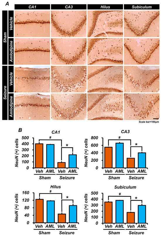 Amlodipine administration increased neuron survival after seizure. (A) Micrographs of NeuN (+) cells representing surviving cells in the hippocampal CA1, CA3, hilus, and subiculum (Sub) regions. The number of surviving neurons appears to be greater in the seizure-amlodipine group than in the seizure-vehicle group. (B) Cell counting in the micrographs of every region shows a significant difference between the sham-vehicle group and the seizure-vehicle group. In the CA1 and hilus regions, cell counting showed that the seizure-amlodipine group had approximately twice the number of NeuN (+) cells as the seizure-vehicle group. In the CA3 and Sub regions, the seizure-amlodipine group had more NeuN (+) cells, which was a noticeable difference from the seizure-vehicle group. Additionally, in every region, there is no significant difference in NeuN (+) cells between the sham-vehicle group and the sham-amlodipine group. Therefore, administering amlodipine after a seizure significantly increases neuron survival compared to treating with a vehicle after a seizure. Animals were sacrificed on day 7. The number of NeuN (+) cells was higher in the seizure-amlodipine group than the seizure-vehicle group by about 58% in the CA1 region (seizure-vehicle group, 89.5 ± 21.5; seizure-amlodipine group, 215.4 ± 32.3; sham-vehicle group, 401.6 ± 22.3; sham-amlodipine group, 389.5 ± 6.9), by 34.3% in the CA3 region (seizure-vehicle group, 257.9 ± 8.7; seizure-amlodipine group, 392.8 ± 24.7; sham-vehicle group, 551.1 ± 28.3; sham-amlodipine group, 659.0 ± 19.4), by 49% in the hilus region (seizure-vehicle group, 46.7 ± 8.0; seizure-amlodipine group, 92.1 ± 10.0; sham-vehicle group, 125.2 ± 11.0; sham-amlodipine group, 117.0 ± 2.8), and by 39% in the subiculum (seizure-vehicle group, 179.9 ± 14.1; seizure-amlodipine group, 297.0 ± 25.4; sham-vehicle group, 353.8 ± 14.9; sham-amlodipine group, 380.3 ± 6.6). Scale bar = 100 µm (the sample sizes were n = 5 animals for each sham group, n = 6 animals for the seizure-vehicle group, and n = 8 animals for the seizure-amlodipine group). (Bonferroni post hoc test after Kruskal–Wallis test, CA1: chi-squared = 17.649, df = 3, p = 0.001; CA3: chi-squared = 18.543, df = 3, p < 0.001; subiculum: chi-squared =15.535, df = 3, p = 0.001; dentate gyrus: chi-squared = 15.649, df = 3, p < 0.001.) # indicates significant difference between sham vehicle and seizure vehicle groups, * Significantly different from the vehicle group, p < 0.05.