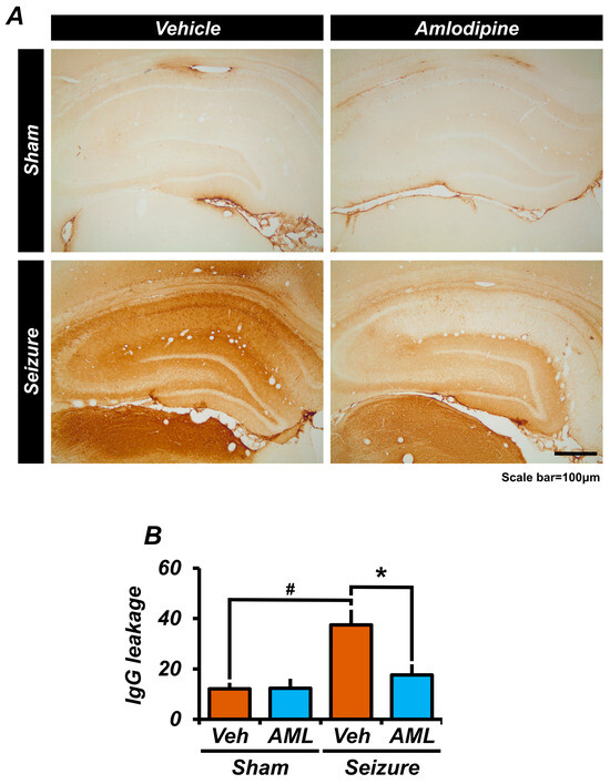 Amlodipine administration reduced blood–brain barrier (BBB) breakdown after seizure. (A,B) The micrographs show the amount of IgG leakage in a specific region of the whole brain. We found a significant difference between the sham-vehicle group and the seizure-vehicle group. There is also a twofold decrease in IgG leakage between the seizure-amlodipine group and the seizure-vehicle group. However, the IgG leakage in the seizure-amlodipine group is similar to that of the sham groups. Also, the sham-vehicle group shows no significant difference when compared with the sham-amlodipine group. This indicates that administering an amlodipine treatment after a seizure significantly reduces IgG leakage. The scale bar represents a distance of 100 µm. The data are presented as mean values with the standard error of the mean (SEM) indicated. The sample sizes were n = 3 animals for each sham group, n = 5 animals for the seizure-vehicle group, and six for the seizure-amlodipine group. The difference between the seizure-amlodipine group and the seizure-vehicle group is considered statistically significant, with a p-value less than 0.05. Animals were sacrificed on day 7. IgG leakage decreased in the seizure-amlodipine group, compared with the seizure-vehicle group, by about 53% in the hippocampal area (seizure-vehicle group, 37.4 ± 6.0; seizure-amlodipine group, 17.6 ± 4.3; sham-vehicle group, 12.1 ± 2.4; sham-amlodipine group, 12.3 ± 3.8). (Bonferroni post hoc test after Kruskal–Wallis test of IgG, CA1: chi-squared = 7.763, df = 3, p = 0.051.) # indicates significant difference between sham vehicle and seizure vehicle groups, * Significantly different from the vehicle group, p < 0.05.