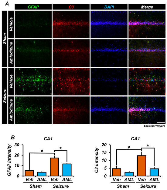 Amlodipine administration reduced astrocyte over-activation after seizure. (A) The micrographs show the staining of GFAP (green), C3 (red), and DAPI (blue) in the hippocampal CA1 region. (B) The bar graph illustrates the intensity of GFAP, which is significantly different in the sham-vehicle group compared with the seizure-vehicle group; there is also a significant difference between the seizure-amlodipine group and the seizure-vehicle group. The intensity of C3 in the seizure-amlodipine group is comparable to each sham group and is approximately three times lower than that of the seizure-vehicle group. There is also a significant difference between the sham-vehicle group and the seizure-vehicle group. Also, there is no significant difference in GFAP and C3 intensity among the various sham groups. This indicates that administering an amlodipine treatment after a seizure reduces the over-activation of astrocytes. The scale bar represents a distance of 100 µm. The data are presented as mean values, with the standard error of the mean (SEM) indicated. The sample sizes were five animals for each sham group, six animals for the seizure-vehicle group, and eight animals for the seizure-amlodipine group. The difference between the seizure-amlodipine group and the seizure-vehicle group is considered statistically significant, with a p-value less than 0.05. Animals were sacrificed on day 7. GFAP and C3 intensity decreased in the seizure-amlodipine group, compared with the seizure-vehicle group, by about 33% in the CA1 region for GFAP (seizure-vehicle group, 17.3 ± 1.8; seizure-amlodipine group, 11.6 ± 1.0; sham-vehicle group, 5.1 ± 0.4; sham-amlodipine group, 3.7 ± 0.8) and by 64% in the CA1 region for C3 (seizure-vehicle group, 17.3 ± 2.5; seizure-amlodipine group, 6.2 ± 1.4; sham-vehicle group, 5.5 ± 1.9; sham-amlodipine group, 12.9 ± 0.8). (Bonferroni post hoc test after Kruskal–Wallis test for GFAP, CA1: chi-squared = 12.894, df = 3, p = 0.005; Bonferroni post hoc test after Kruskal–Wallis test for C3, CA1: chi-squared = 12.246, df = 3, p = 0.007.) # indicates significant difference between sham vehicle and seizure vehicle groups, * Significantly different from the vehicle group, p < 0.05.